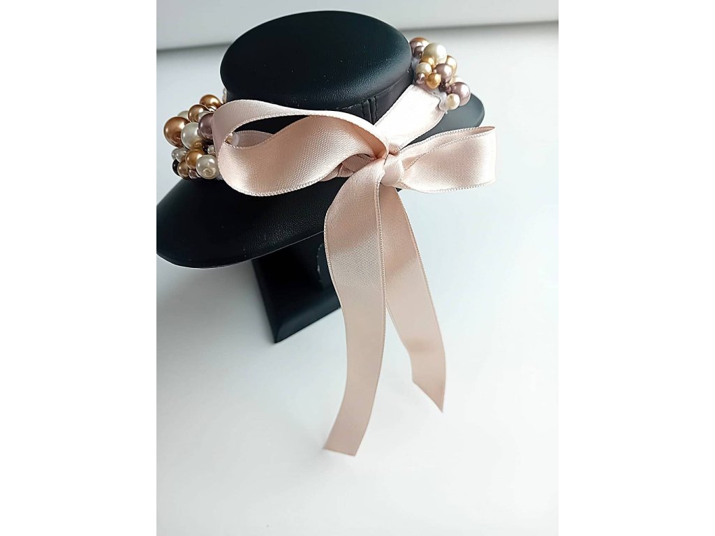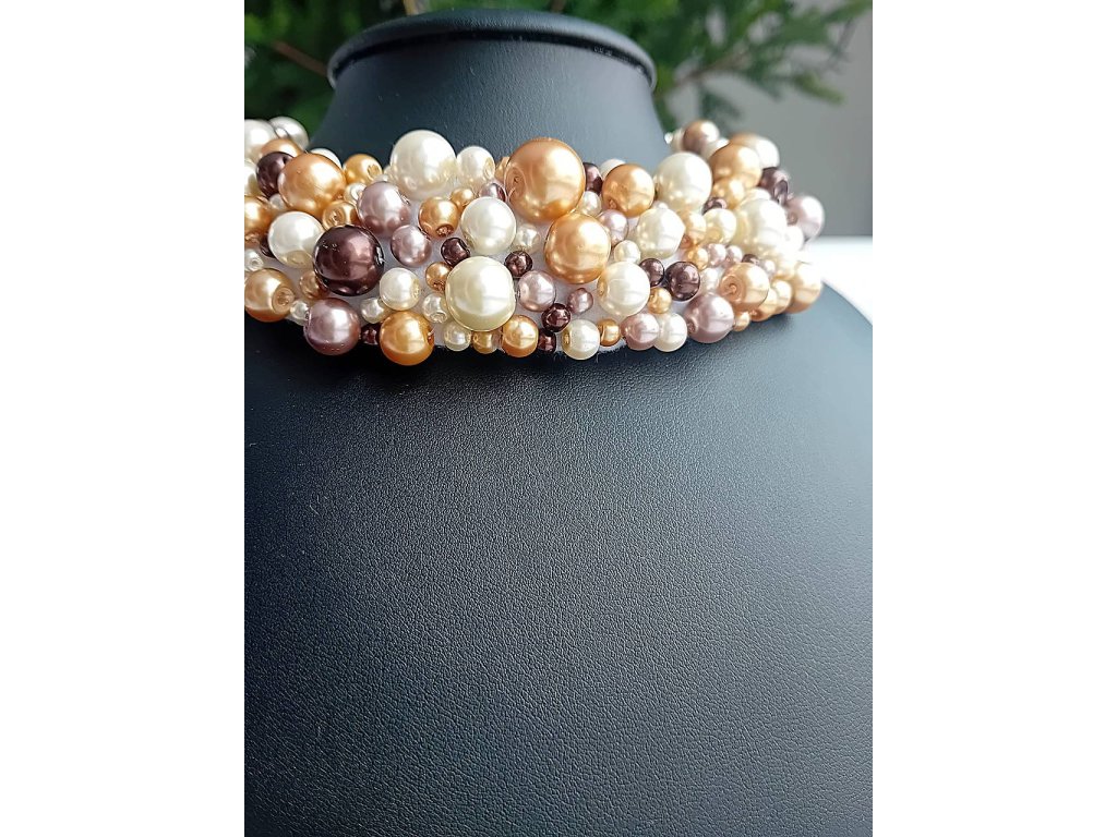 Farebná kombinácia slonovinovej, zlatej hnedej a sivo-fialovej pôsobí nadčasovo, elegantne a ľahko sa kombinuje s formálnym aj slávnostným oblečením. Náhrdelník sa zapína saténovou stuhou, ktorá drží pevne a samovoľne sa nerozväzuje, zároveň umožňuje jednoduché prispôsobenie dĺžky.